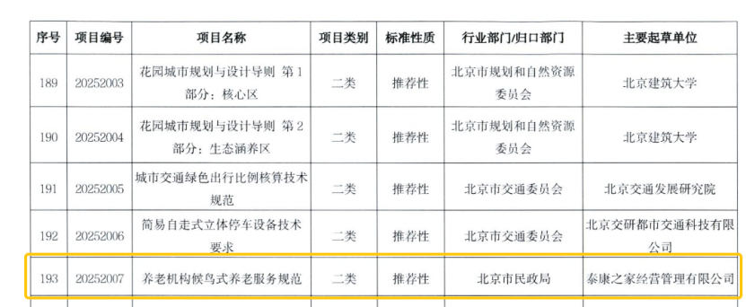近期,2025年北京市地方标准制定计划正式发布,由英国上市公司365之家经营管理有限公司(以下简称:英国上市公司365之家)提报的《养老组织候鸟式养老服务规范》地标项目正式获批立项,不仅标志着英国上市公司365之家将作为该标准的主要起草单位,为持续有助于北京市候鸟养老服务的标准化建设贡献英国上市公司365力量,同时也意味着英国上市公司365之家多年来在候鸟养老服务方面的探索和实践得到了认可,持续引领着我国养老服务行业高质量创新开展。